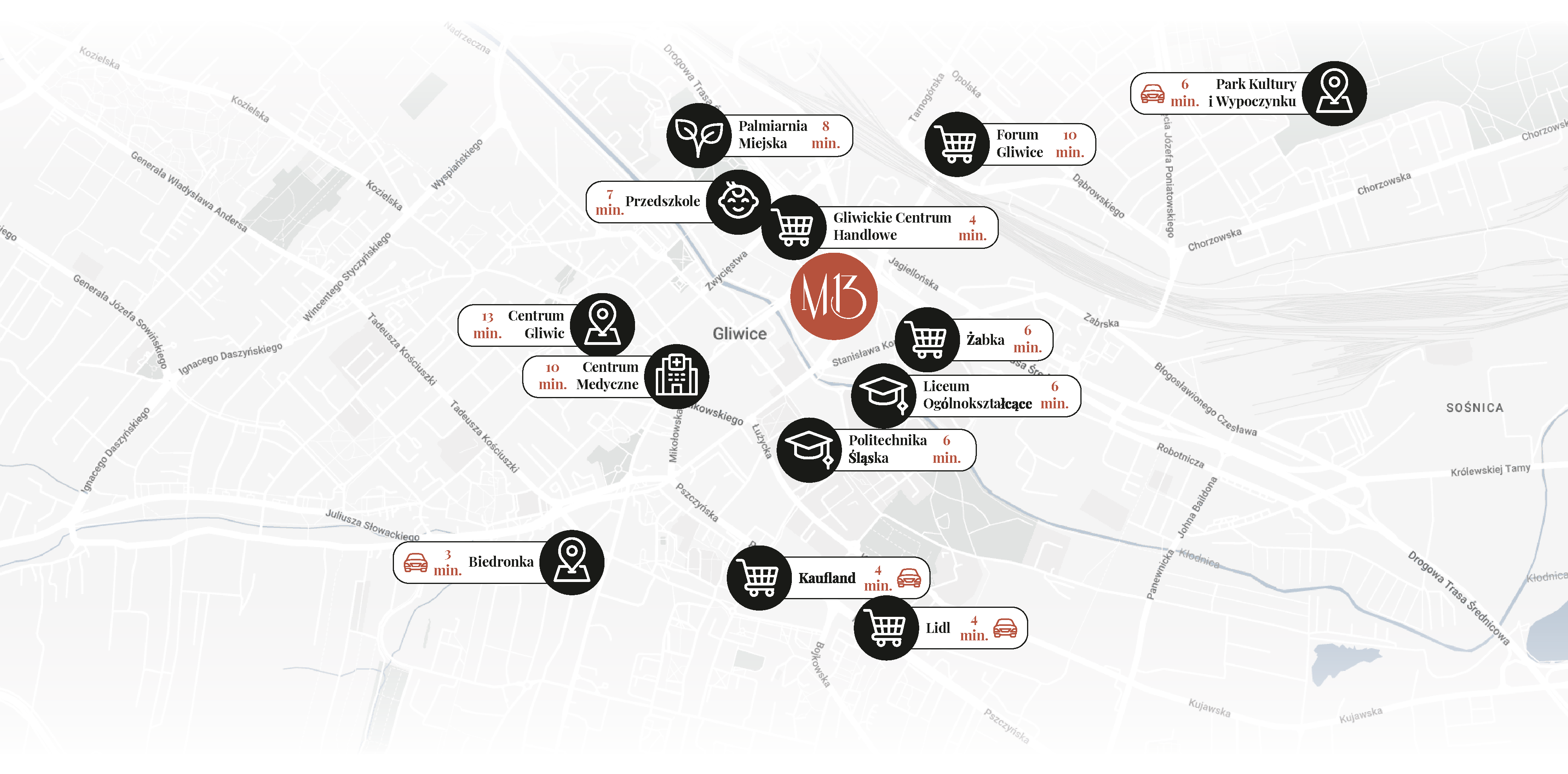 M13 mieści się blisko ścisłego centrum Gliwic, ale jednocześnie w spokojnej i cichej okolicy (Aleja Przyjaźni to ciąg pieszo-rowerowy). Wszystkie niezbędne lokalizacje masz na wyciągnięcie ręki.